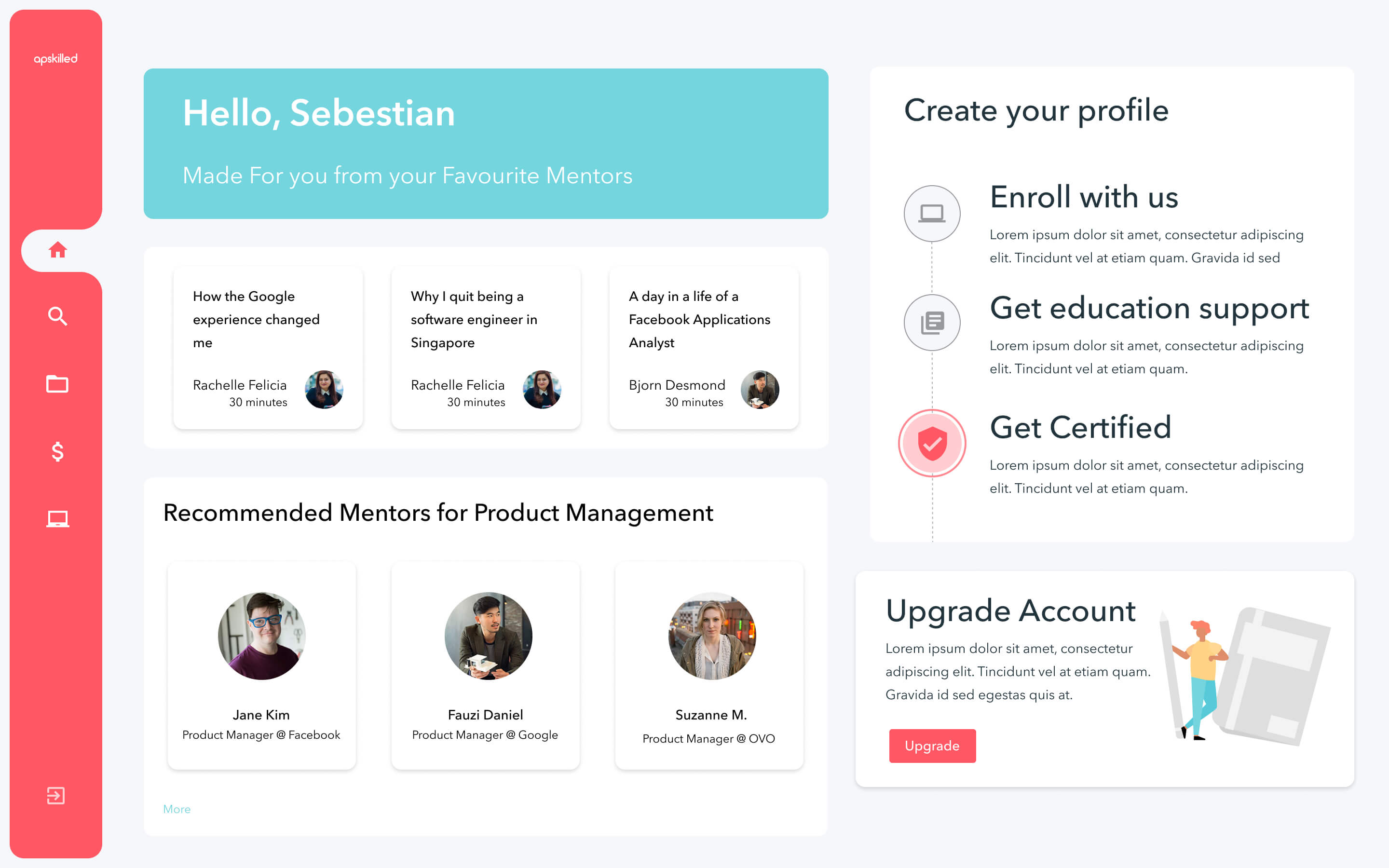 Apskilled enhances on our engagement in mentoring and focusing technology as the learning source. Our Servicable obtainable market is at 96k of tech-savvy professionals to be our potential mentors.