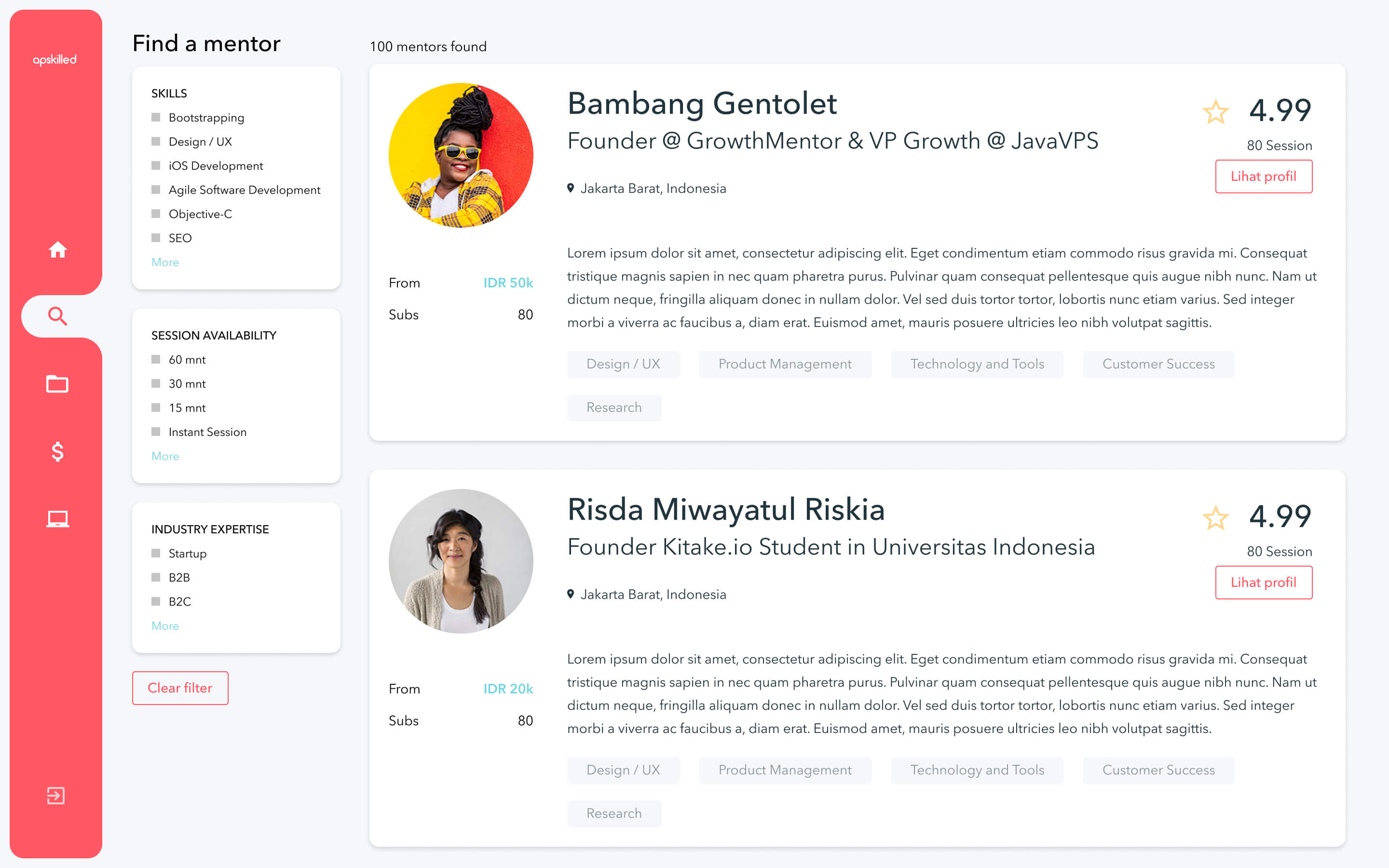 I wanted to simplify mentee to find their mentor. by creating 3 important filters on the left of the screen and a brief explanation of the mentor. Spend less time researching and more time getting the full experience on their next class.